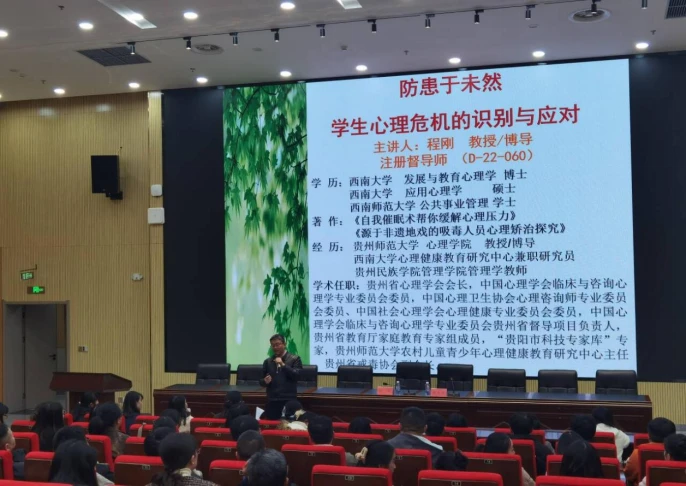 2025年11月21日下午,遵义职院全体教职员工在图书馆大楼A区学术报告厅,开展了“学生心理危机干预工作”的培训,本次培训由遵义职院基础部主任陈良万教授主持,特邀知芯云(贵州)科技有限公司博士创新站执行站长、贵州师范大学应用心理学系系主任、博士生导师、注册督导师程刚教授主讲。